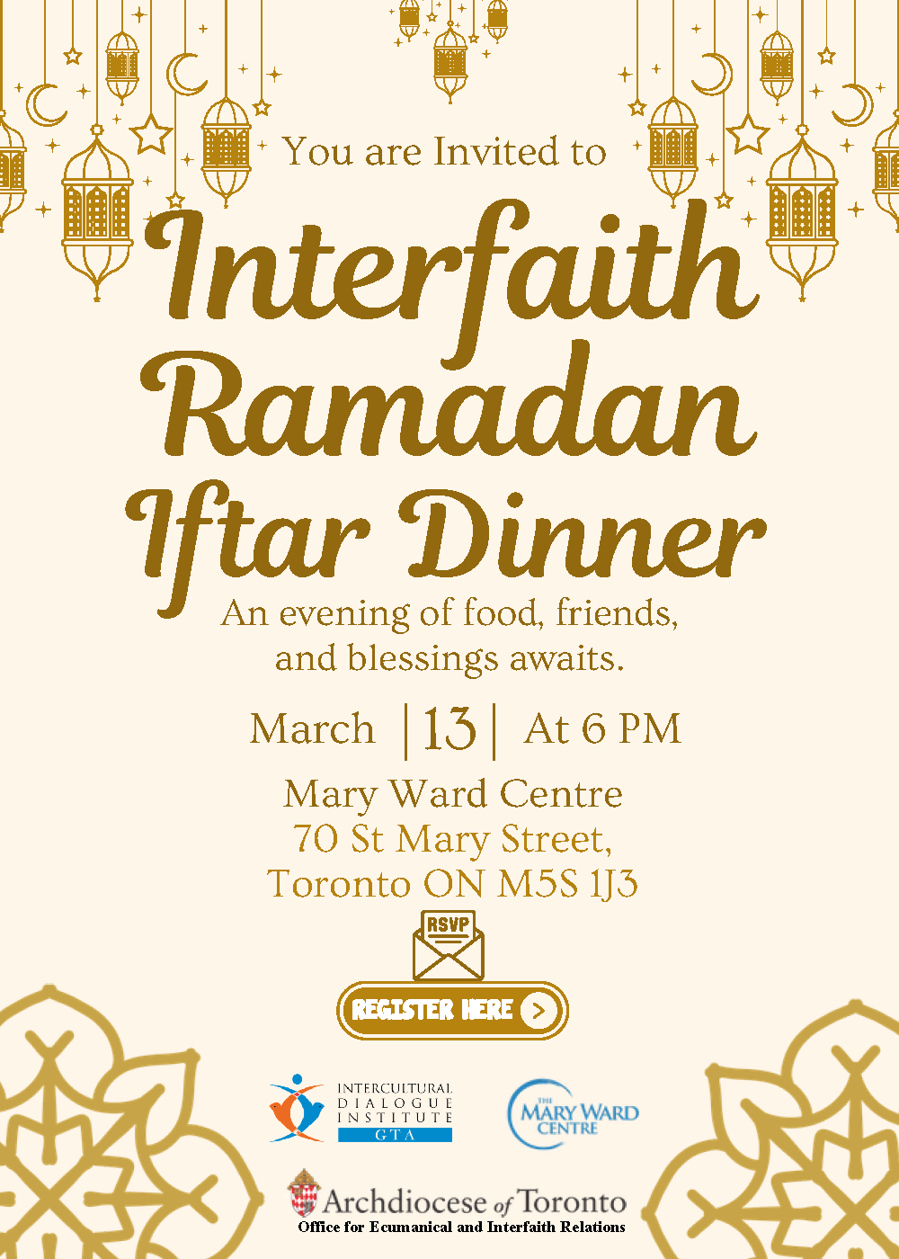 Join us for an evening of food, friendship, and reflection at the Interfaith Ramadan Iftar Dinner — a special gathering co-hosted by the Intercultural Dialogue Institute (IDI) GTA, The Mary Ward Centre, and the Archdiocese of Toronto – Office for Ecumenical and Interfaith Relations.